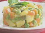 Mondate e tagliate a brunoise la carota e la patata. Cuocete a vapore insieme ai piselli e poi tenete da parte a raffreddare.